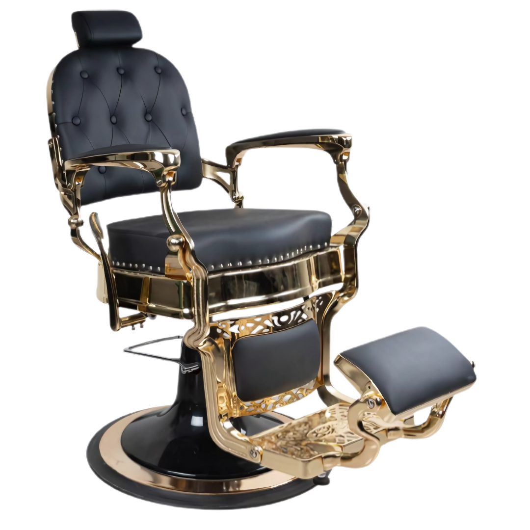 Deze luxe kappersstoel heeft een klassieke design met een moderne afwerking. De stoel is voorzien van een gewatteerd zitvlak en rugleuning met knoopdetails, gecombineerd met stevige metalen accenten.