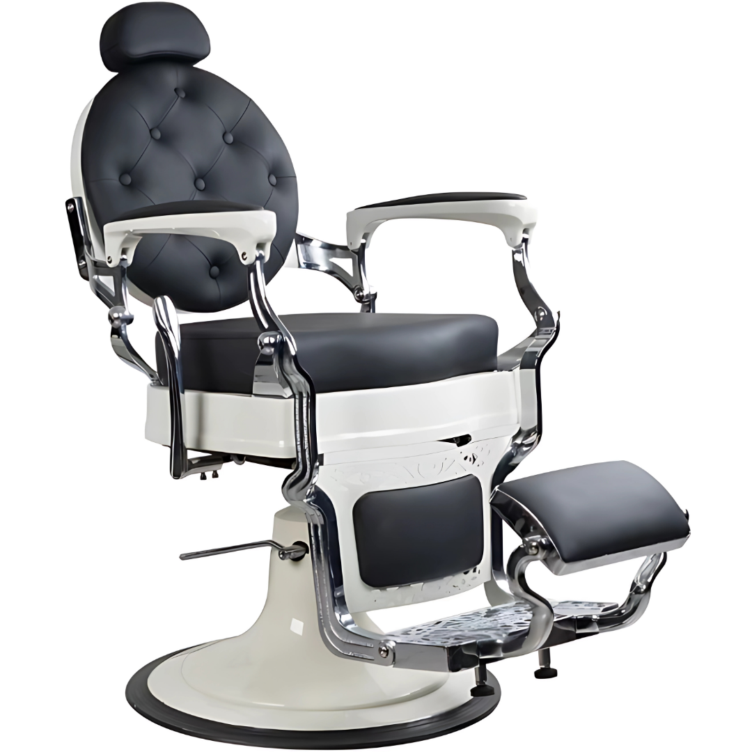 Deze luxe kappersstoel heeft een klassiek vintage design met een moderne afwerking. De stoel is voorzien van een gewatteerd zitvlak en rugleuning met knoopdetails, gecombineerd met stevige metalen accenten.