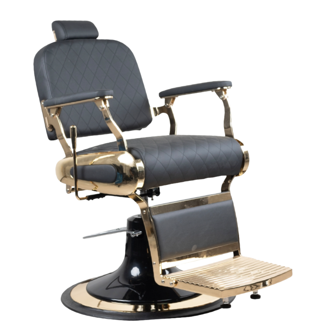 Deze luxe kappersstoel heeft een klassieke design met een moderne afwerking. De stoel is voorzien van een gewatteerd zitvlak en rugleuning met een strak ontwerp, gecombineerd met stevige metalen accenten.