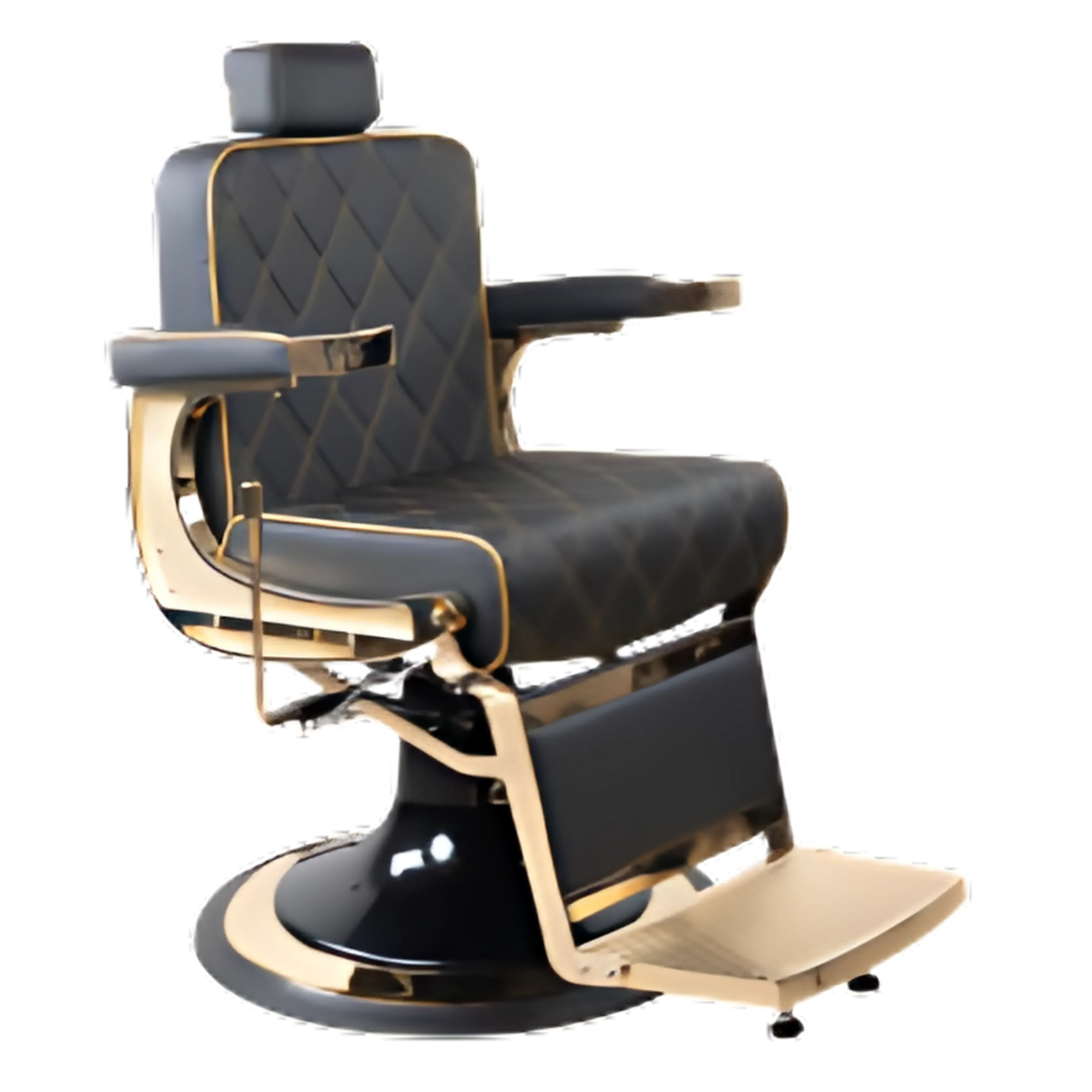 Deze luxe kappersstoel heeft een klassieke design met een moderne afwerking. De stoel is voorzien van een gewatteerd zitvlak en rugleuning met een strak ontwerp, gecombineerd met stevige metalen accenten.
